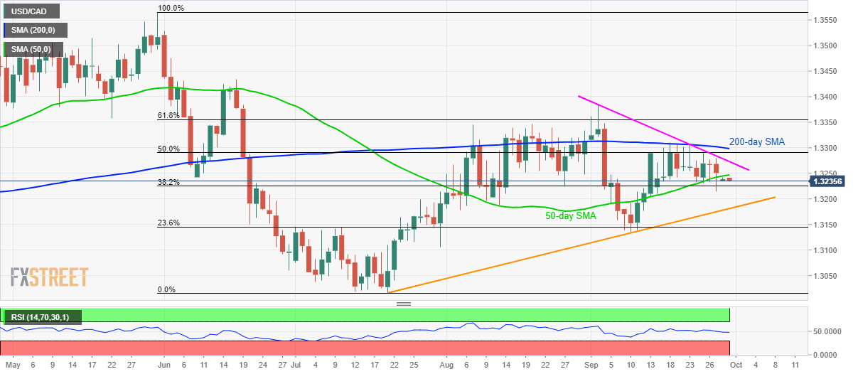 With its sustained trading below the 50-day simple moving average (SMA), USD/CAD declines to 1.3235 during early Asian session on Monday.