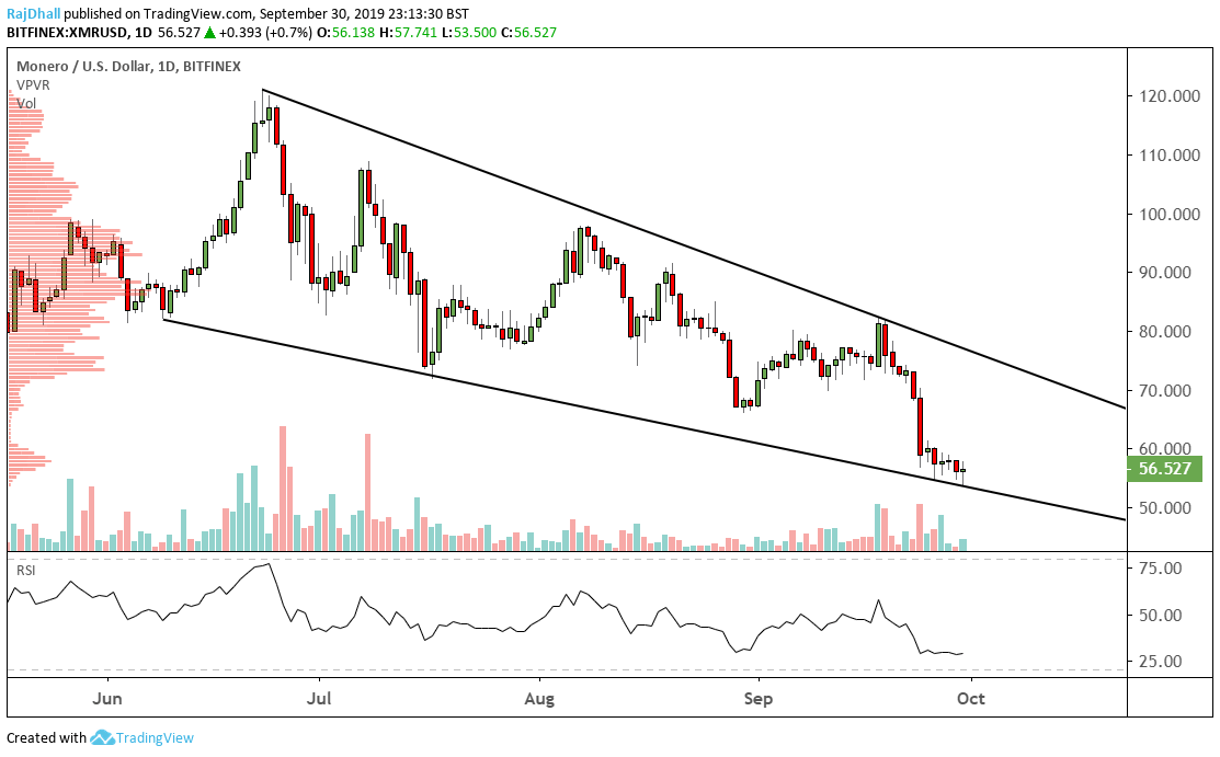 XMR/USD is in a clear downtrend and in around five months has lost a massive 53%. It does look like XMR is trying to base out but the price is hugging the bottom of the falling wedge pattern.