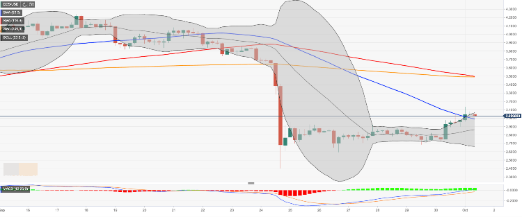 EOS/USD is changing hands at $3.00, off the intraday high reached at $3.13. The coin has gained about 10% of its value on a day-on-day basis amid the global recovery on the cryptocurrency markets. If the price stays above $3.00, the recovery may be extended towards the next bull’s target at $3.50 protected by SMA100 (Simple Moving Average) and SMA200 four-hour.