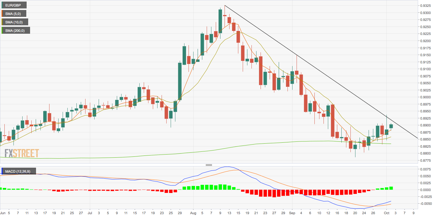EUR/GBP is solidly bid at press time and looks set to challenge the trendline connecting Aug. 12 and Sept. 3 highs for the second consecutive day.