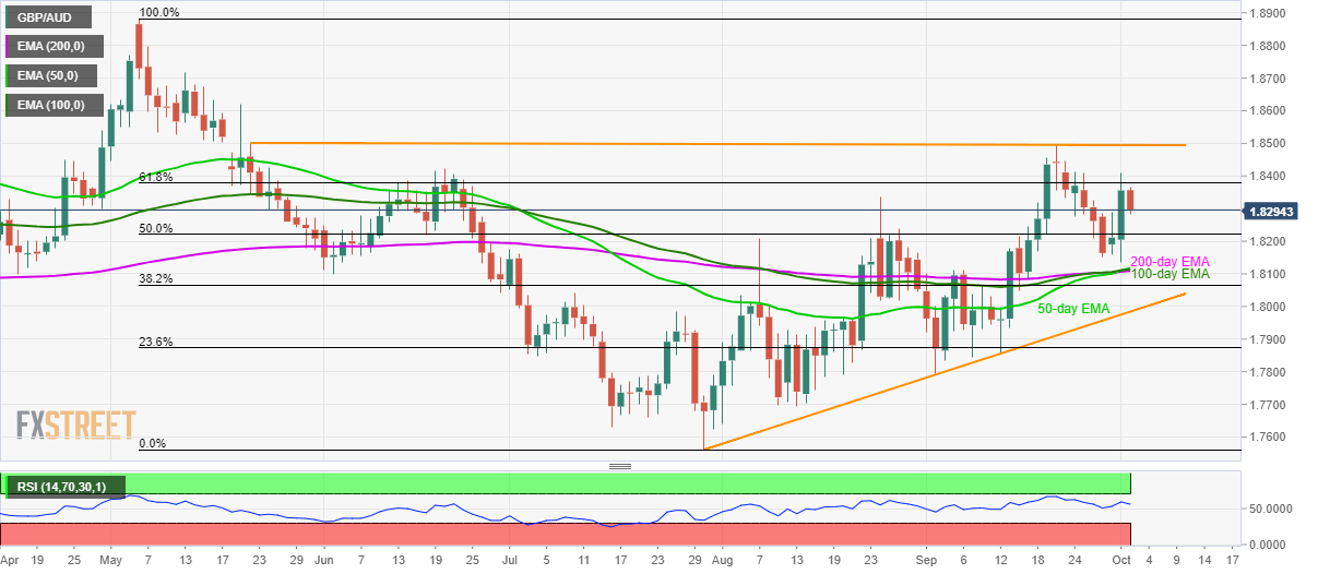 While failure to sustain a break of 61.8% Fibonacci retracement of May-July downpour drags the GBP/AUD pair, a confluence of key exponential moving averages (EMAs) offers strong downside support as the quote seesaws near 1.8290 by the press time ahead of Europe open on Wednesday.