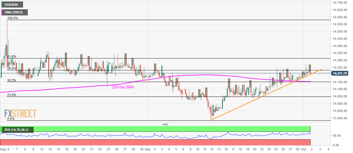 Despite witnessing pullback, the USD/IDR pair remains above a three-week-old rising trend-line while taking rounds to 14,210 during early Wednesday.