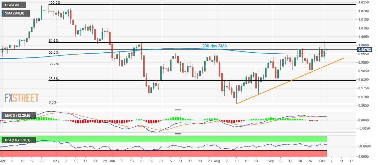 Despite successfully trading above key support confluence, the USD/CHF pair fails to provide a daily closing above 61.8% Fibonacci retracement of April-August downpour. The quote takes the bids to 0.9975 while heading into the European open on Thursday.