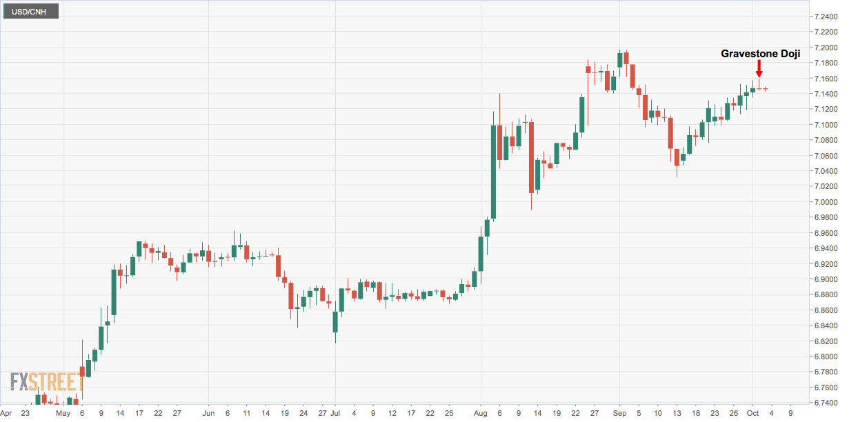 Home USD/CNH technical analysis: Looks heavy due to Wednesday’s Gravestone Doji