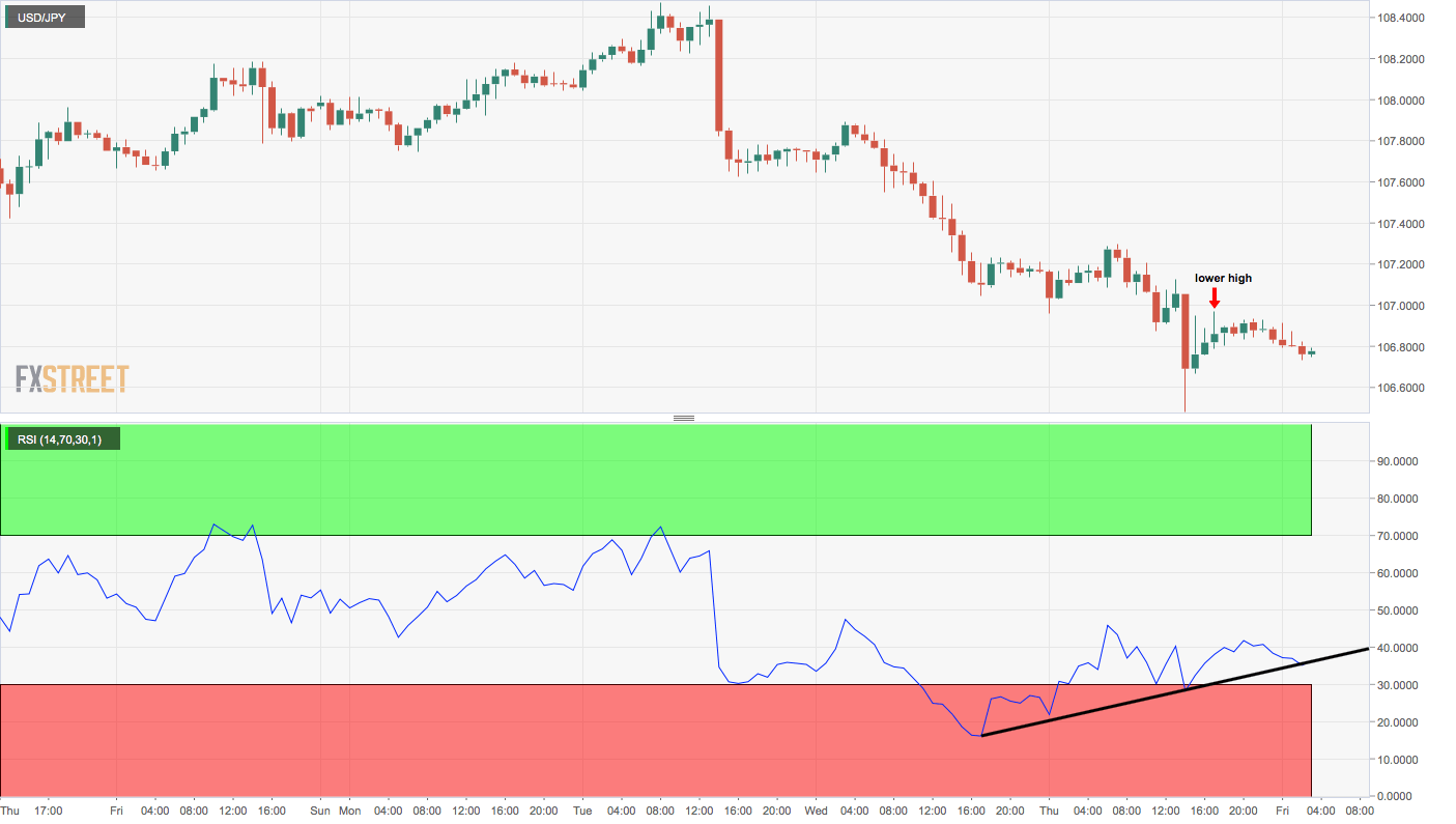 - USD/JPY is looking south, having charted a bearish lower high above 106.90 in Asia.
