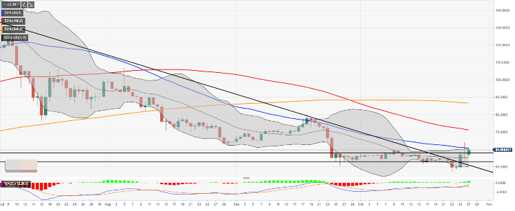 Looking technically, LTC/USD created a top at $64.10 on October 26 only to retreat back inside the range limited by $60.70 on the upside. This resistance is created by SMA50 (Simple Moving Average) and the upper line of a Bollinger Band on a daily chart. Once it is out of the way, the upside is likely to gain traction with the next focus on the recent top, followed by a psychological $65.00.