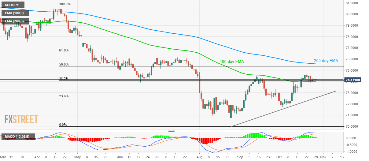 The quote nears 38.2% Fibonacci retracement of April-August downpour and 100-day Exponential Moving Average (EMA), around 74.10/74.00, a break of which could push sellers to step in and target mid-October lows nearing 73.00.