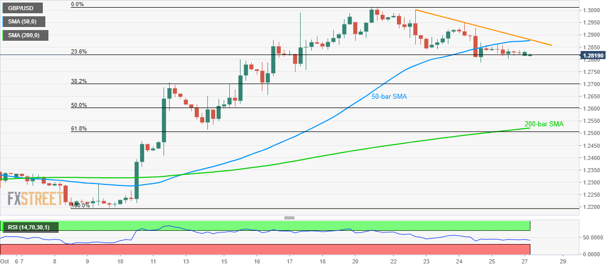 Although 23.6% Fibonacci retracement of the recent run-up holds tightly to the GBP/USD pair, failure to rise past 50-day SMA and a short-term descending resistance keep sellers hopeful. The quote takes the rounds to 1.2820 while heading into the London open on Monday.