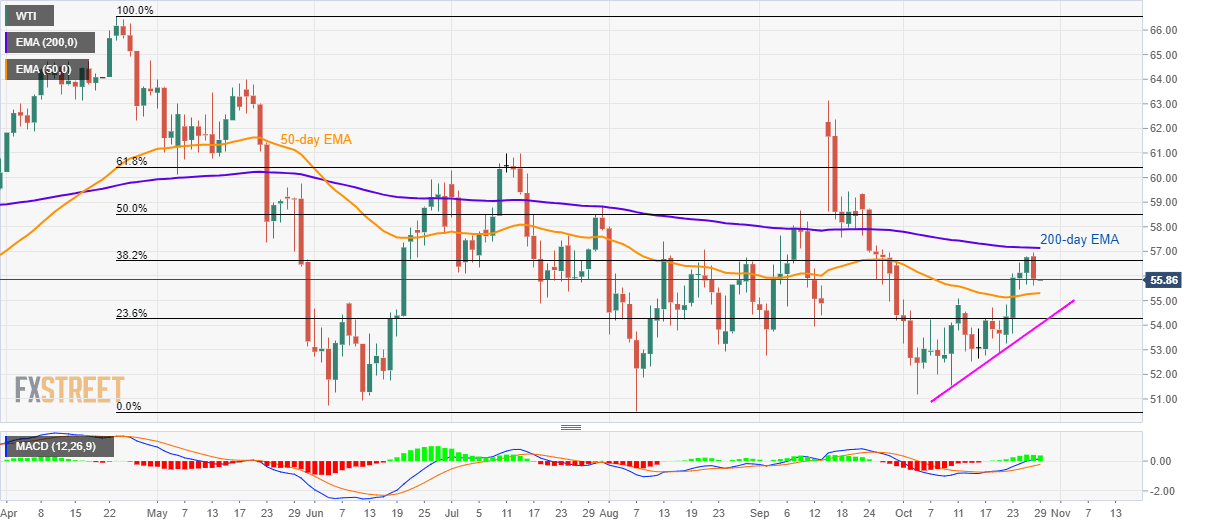 Having reversed from 200-day EMA, WTI seesaws around $55.85 during Tuesday’s initial hours of the Asian session.