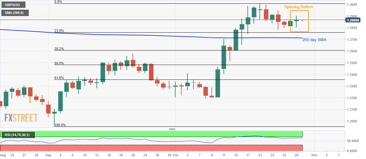 While considering the pair’s momentum since October 21 on a daily (D1) chart, GBP/USD formed a spinning bottom bullish candlestick pattern on Tuesday. Prices are mildly bid around 1.2870 ahead of the London open on Wednesday.