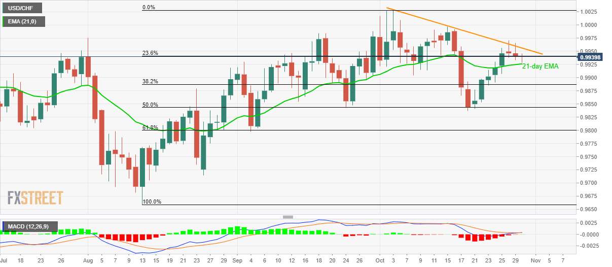 Given the monthly falling resistance line and 21-day EMA confusing USD/CHF traders on a key day, the quote seesaws near 0.9940 during pre-European session on Wednesday.