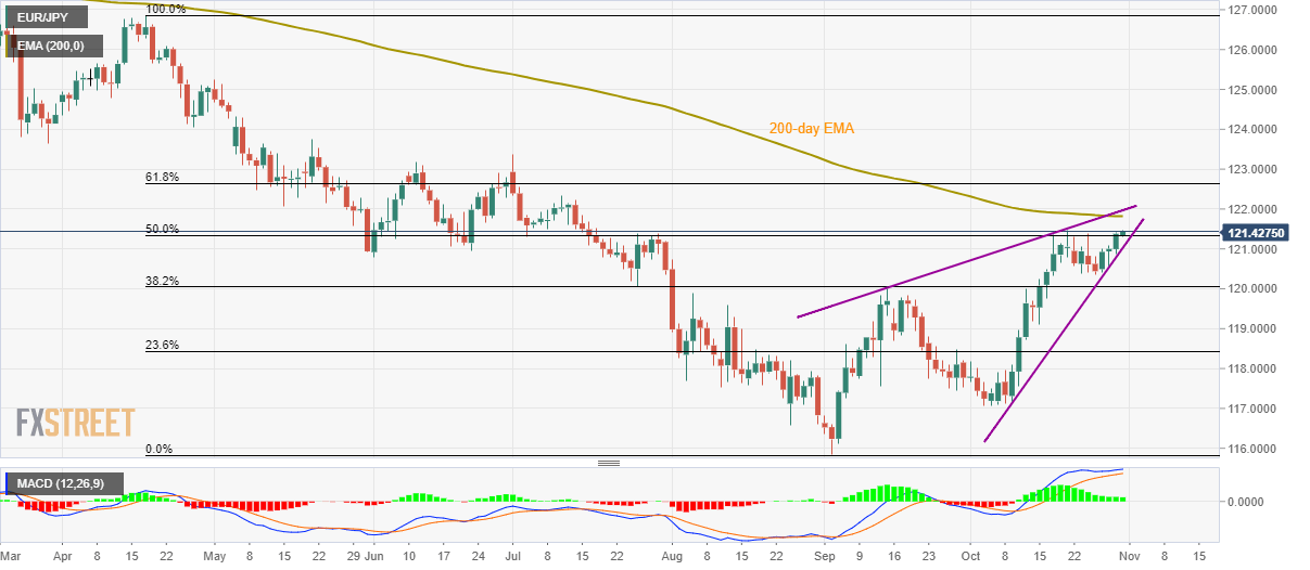 - EUR/JPY clings to 50% Fibonacci retracement of April-September declines.