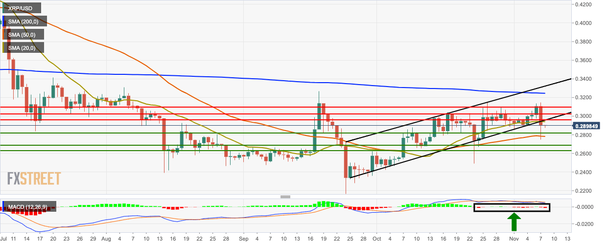 XRP/USD went down from $0.2905 to $0.289 so far this Friday. After dropping below the $0.30-zone and the upward channel formation this Thursday, the bears have remained in control. The Moving Average Convergence/Divergence (MACD) indicates sustained bearish sentiment.