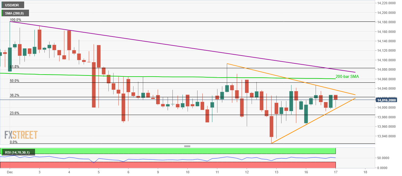 USD/IDR stays inside four-day-old triangle formation while trading around 14,015 during early Tuesday. In doing so, the pair remains below 200-bar Simple Moving Average (SMA) and a downward sloping trend line since December 02.