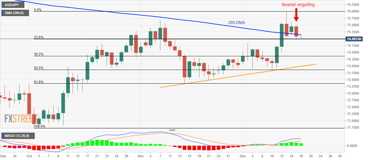 After flashing a bearish candlestick formation on the daily (D1) chart, AUD/JPY trades around 75.00 amid Wednesday morning in Asia. The pair now clings to 23.6% Fibonacci retracement of its run-up from October start.