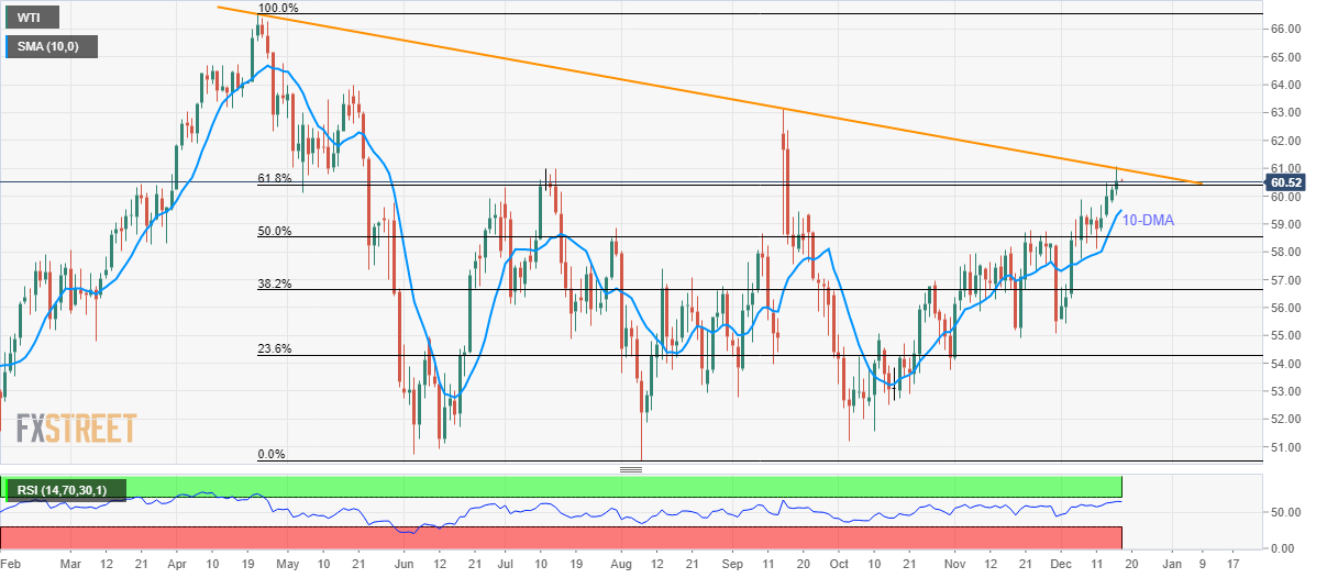 WTI bulls seem to catch a breath around $60.50 during the initial trading session on Wednesday. The black gold surged to the fresh highs since September on Tuesday. However, a downward sloping trend line since April restricts immediate upside.