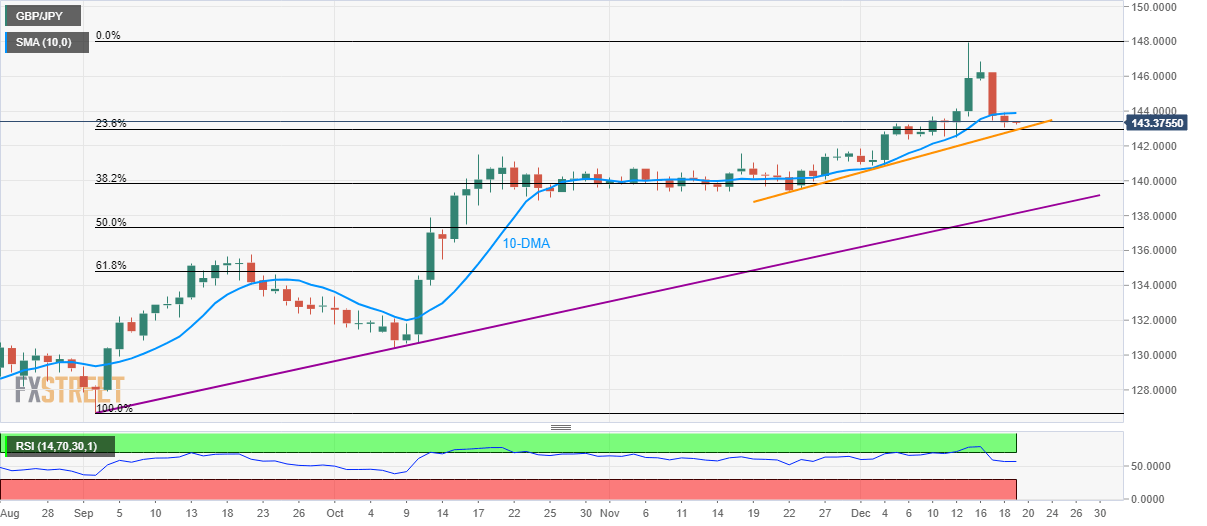Following its sustained trading below 10-Day Simple Moving Average (DMA), GBP/JPY seesaws around 143.37 during Thursday’s Asian session.