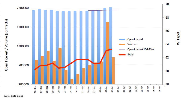In light of preliminary readings for Crude Oil futures markets from CME Group, open interest kept rising on Monday, this time by around 17K contracts. Volume, instead, went down by a significant 457.6K contracts, recording the first drop since December 24th.