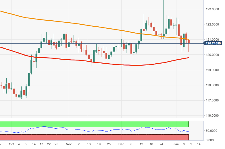 If the downside pressure gains further steam, the cross could likely breach the so far 2020 lows in the low-120.00s and attempt a move to the 100-day SMA in the 119.70 region in the near term.