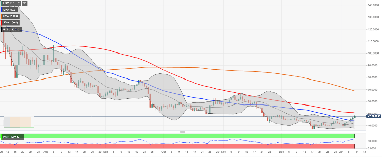 On the upside, we will need to see a sustainable move above the recent top for the upside to gain traction. Once LTC/USD passes $48.50, another strong barrier created by a psychological $50.00 will come into focus. It is closely followed by SMA100 daily at $50.75. The last time LTC traded above this MA in the middle of July 2019.