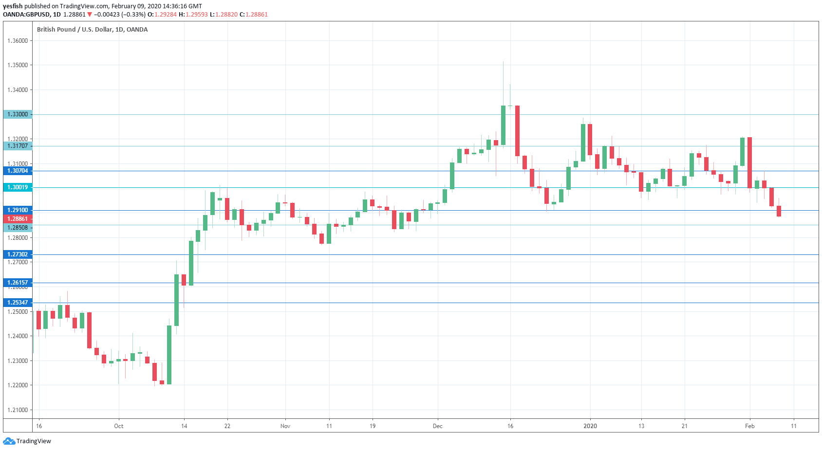 GBP/USD daily graph with resistance and support lines on it. Click to enlarge: