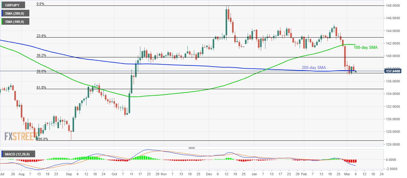 GBP/JPY registers mild gains of 0.15% while rising to 137.52 as the Tokyo session begins for Friday. In doing so, the pair takes another U-turn from 50% Fibonacci retracement of its August-December upside.