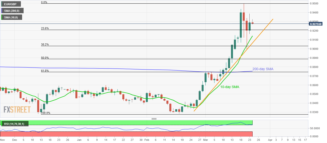 While extending its pullback moves from the multi-year top, EUR/GBP drops 0.16% to 0.9275 during the pre-European session on Tuesday. Even so, the pair stays above near-term key supports, which in turn keeps buyers hopeful.