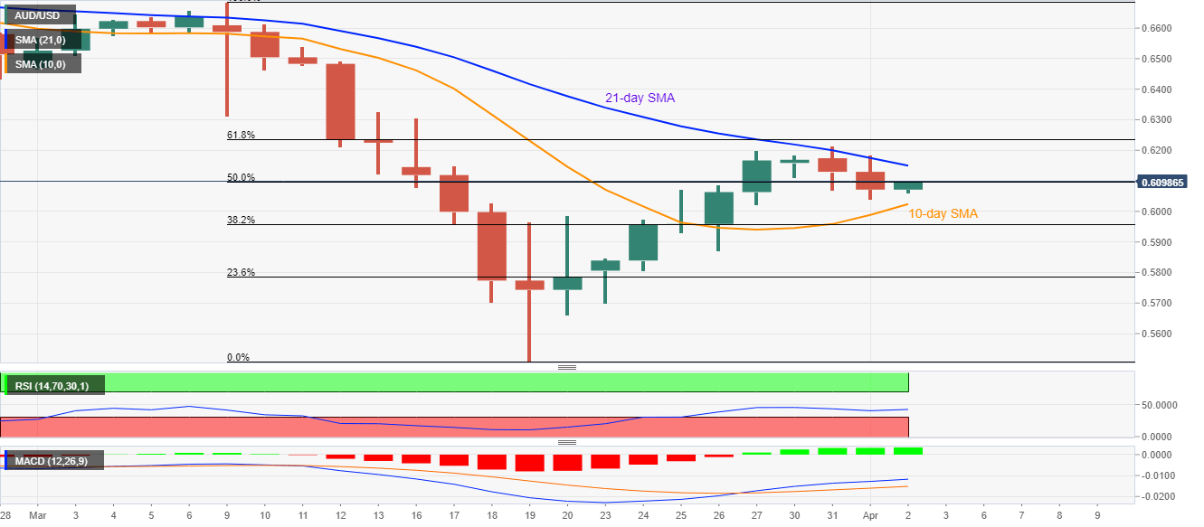 In doing so, the pair confronts the 50% Fibonacci retracement of March month declines and defies the previous two-day declines. However, the pair remains below 21-day SMA and 61.8% Fibonacci retracement level, which in turn question the buyers.