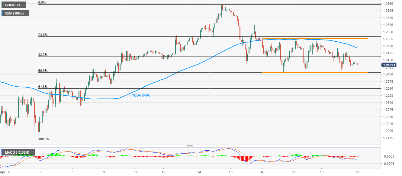 GBP/USD drops to 1.2431 amid the early Asian session on Tuesday. Even so, the pair remains between the ranges established since last Thursday amid bearish MACD.