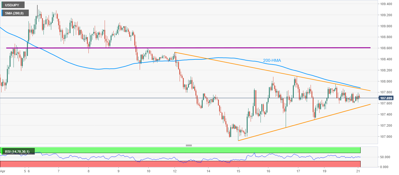 Hence, buyers are likely to enter the trade beyond 107.85/90 resistance confluence, comprising the pattern’s upper line and 200-HMA, whereas sellers may cheer the break below 107.50.