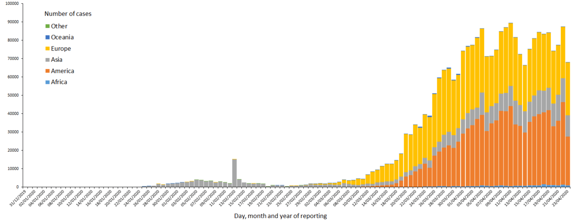 According to the European Centre for Disease Prevention and Control, since 31 December 2019 and as of 23 April 2020, 2 588 068 cases of COVID-19 (in accordance with the applied case definitions and testing strategies in the affected countries) have been reported, including 182 808 deaths.