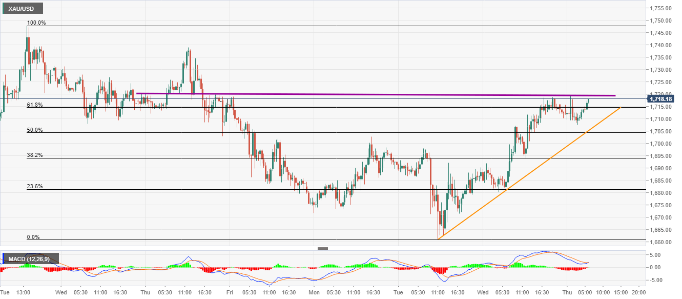 Gold remains on the recovery mode from the intraday low around $1,707 to currently near $1,716 during the early Thursday. Even so, the bullion remains below a week-old horizontal resistance.