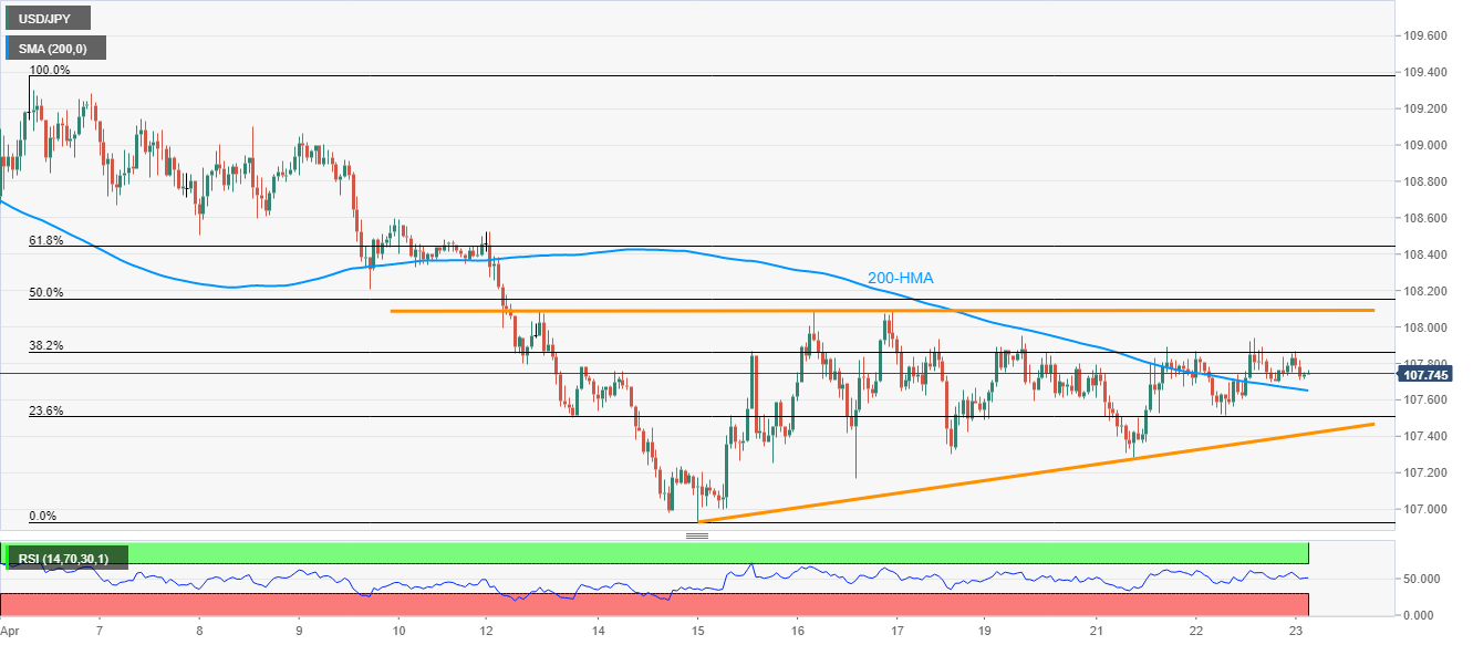 USD/JPY registers dormancy while taking rounds to 107.76, above 200-HMA, during the early Thursday. In doing so, the pair stays inside an eight-day-old ascending triangle formation.
