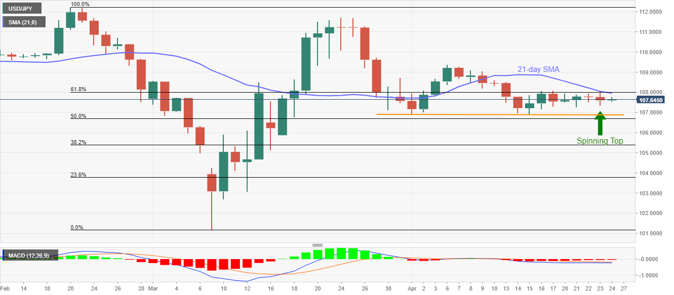 While a spinning top suggested bears’ exhaustion on Thursday, a confluence of 21-day SMA, and 61.8% Fibonacci retracement of the pair’s February-March fall, near 107.95/108.00 restricts the recoveries.