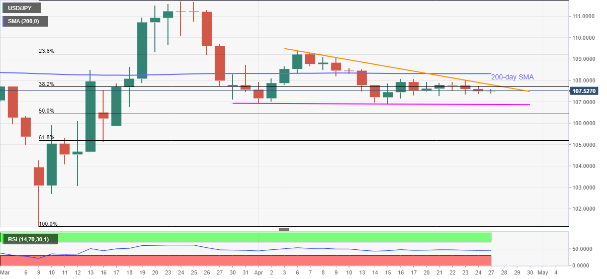 38.2% Fibonacci retracement of March month upside and the resistance line of the monthly triangle restrict the pair’s near-term upside respectively around 107.70 and 107.80.