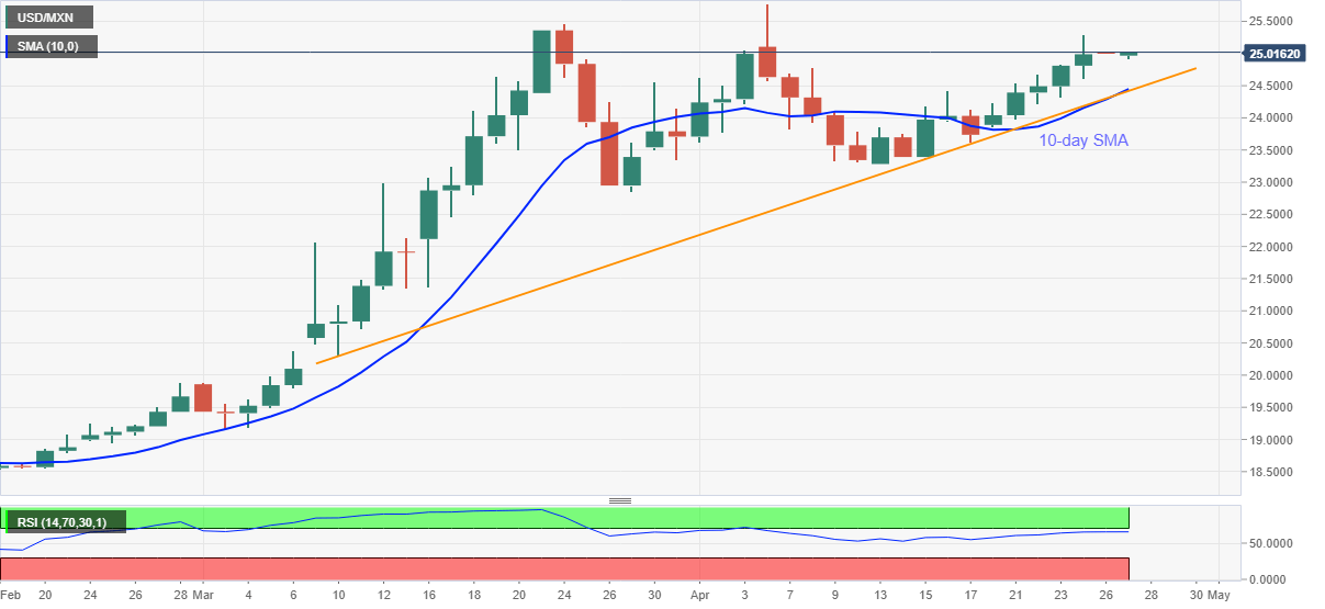 USD/MXN takes the bids to 25.02, up 0.10% on a day, during the early Asian session on Monday.