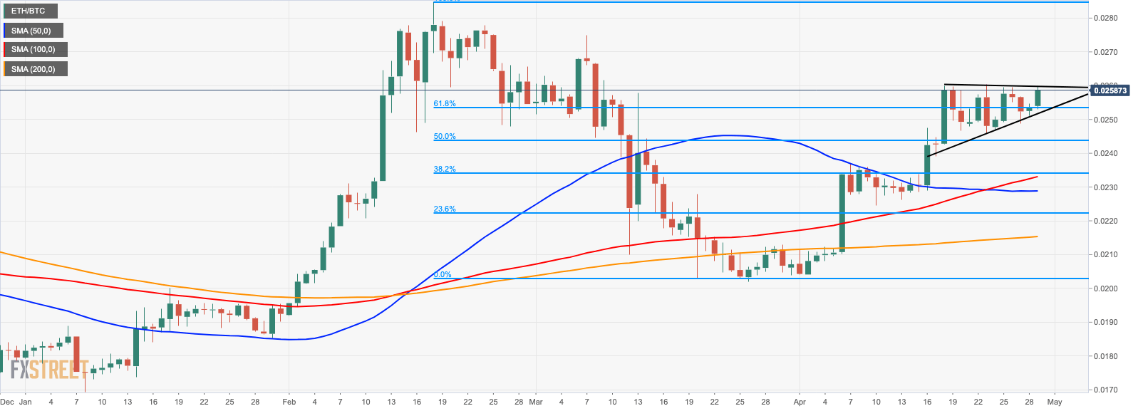 From the technical point of view, ETH/BTC has been moving within a large triangle formation since April 18, after ETH broke above 50% Fibo retracement for the downside move from February 2020 high. The resistance created by the upper boundary of the triangle at $0.02600 has been verified on several occasions during the recent week. If the bulls manage to take it out, the upside momentum will start snowballing with the next focus on $0.02700 and $0.2740, which is the highest level since March 7.