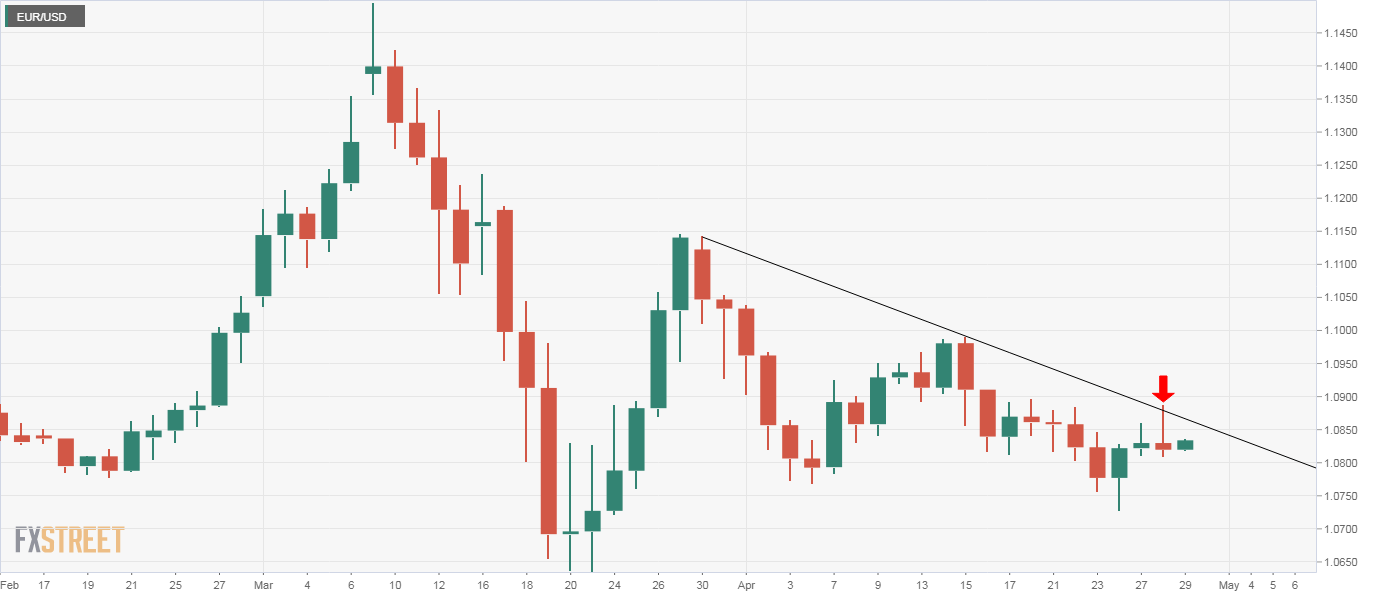 The currency pair formed an inverted bearish hammer or bearish pin bar candle on Tuesday as it faced rejection at highs around the resistance of the trendline connecting March 30 and April 15 lows and ended the day on a negative note.