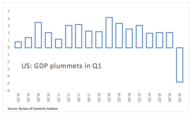 - US advanced Q1 GDP contracted 4.8%, missing consensus.