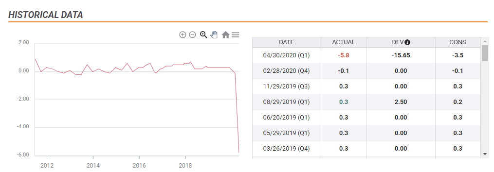 France reported a plunged of 5.8% in its Gross Domestic Product in the first quarter of 2020, worse than a quarterly fall of 4% expected. Year on year, output shrank by 5.4%, more than a 3.6% forecast. That is the worst quarter on record and the spring quarter will likely be worse.