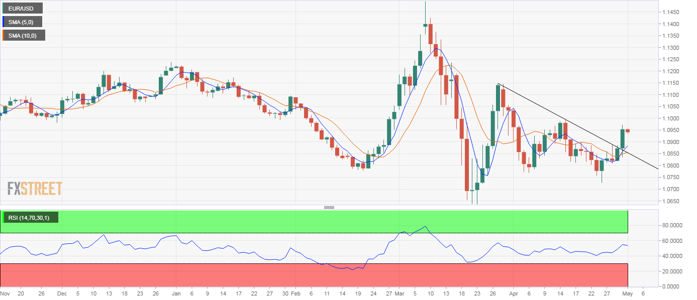 - EUR/USD’s daily chart shows an upside break of a descending trendline.