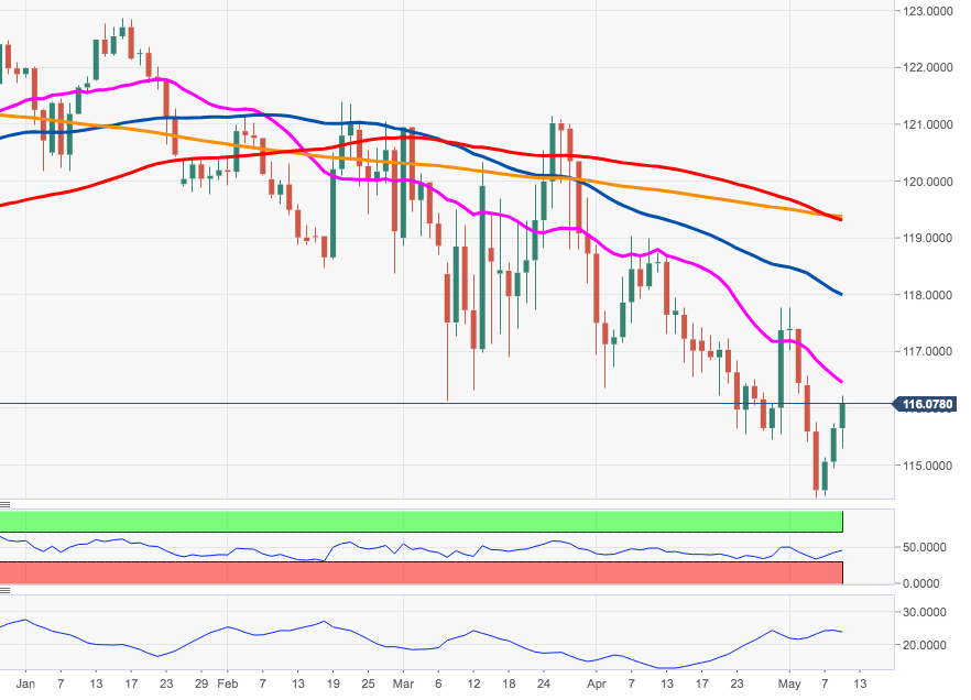 The ongoing recovery is expected to meet the next hurdle at the short-term resistance line around 117.00 ahead of may lows in the 117.80 region.