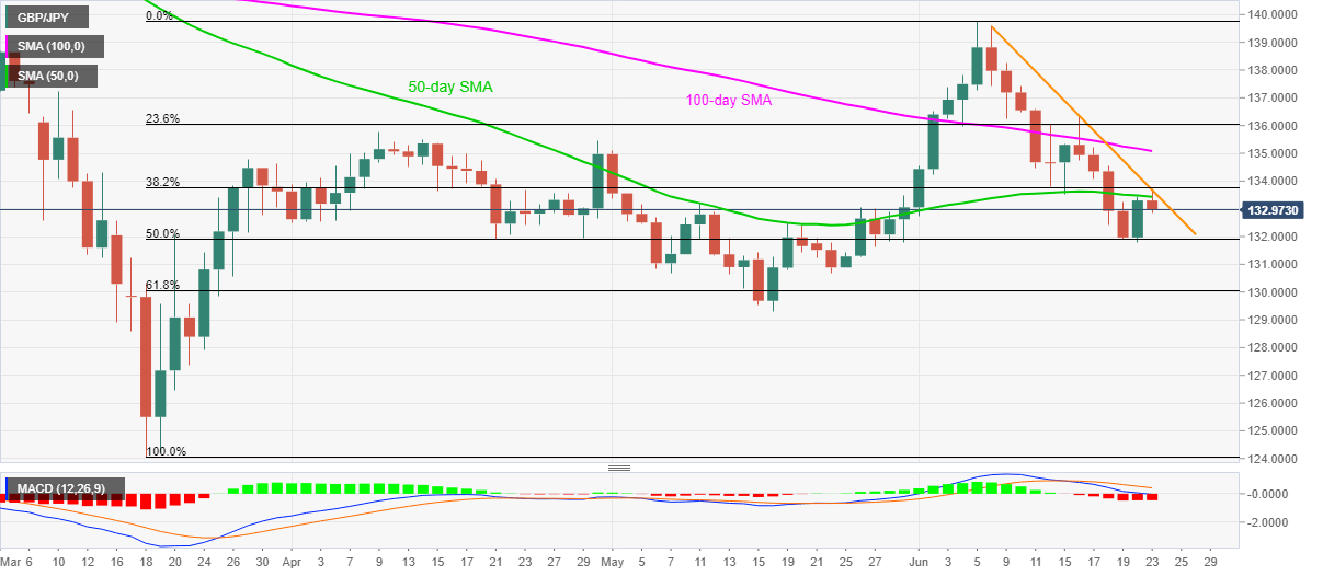 GBP/JPY slips below 133.00, intraday low of 132.93, down 0.22% during the early Tuesday. The pair’s latest weakness could be attributed to its failure to cross the 50-day SMA and a falling trend line from June 08 amid bearish MACD signals. As a result, the quote defies the previous day’s recovery moves from 50% Fibonacci retracement level of March-June upside.