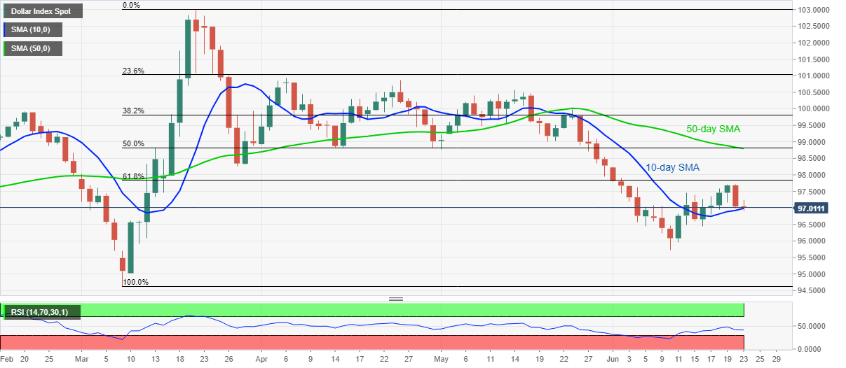Even so, 10-day SMA offers immediate support to the index around 97.00, a break of which could drag the pair to last Tuesday’s low near 96.45.