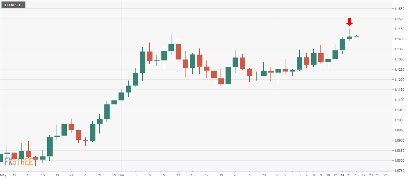 EUR/USD is currently trading at 1.1314, having clocked a four-month high of 1.1452 on Wednesday.