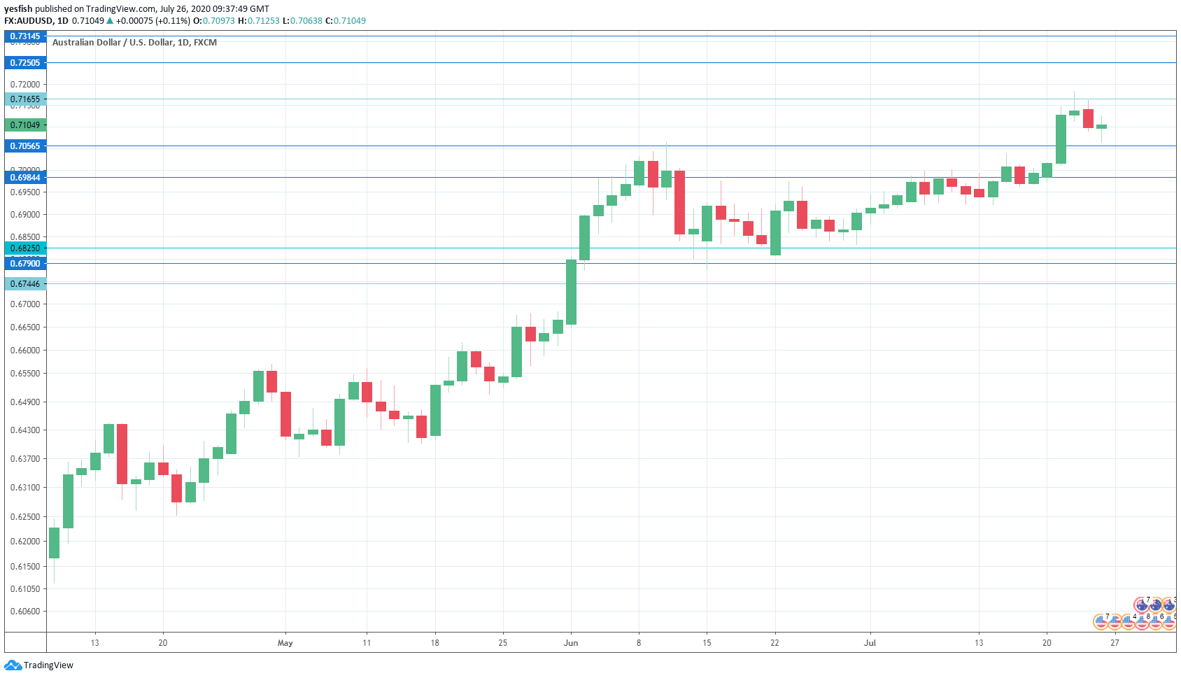 AUD/USD daily chart with support and resistance lines on it. Click to enlarge:
