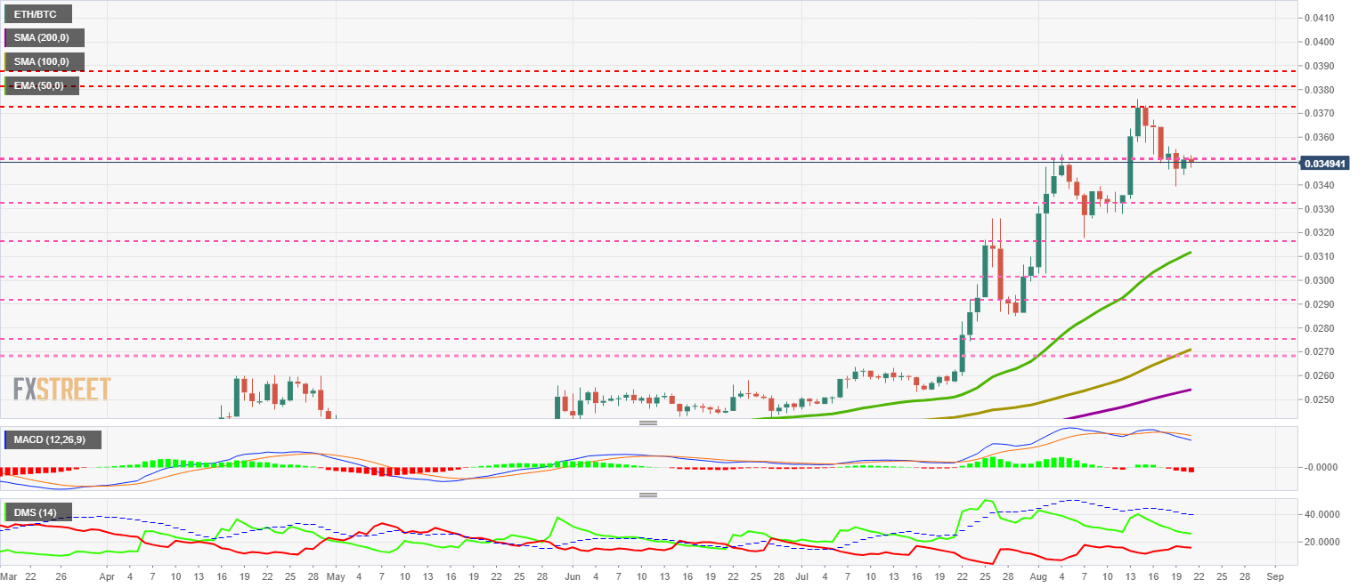 The ETH/BTC pair is currently trading at the price level of 0.0349 and is once again attempting to break out of the price congestion resistance at 0.035.