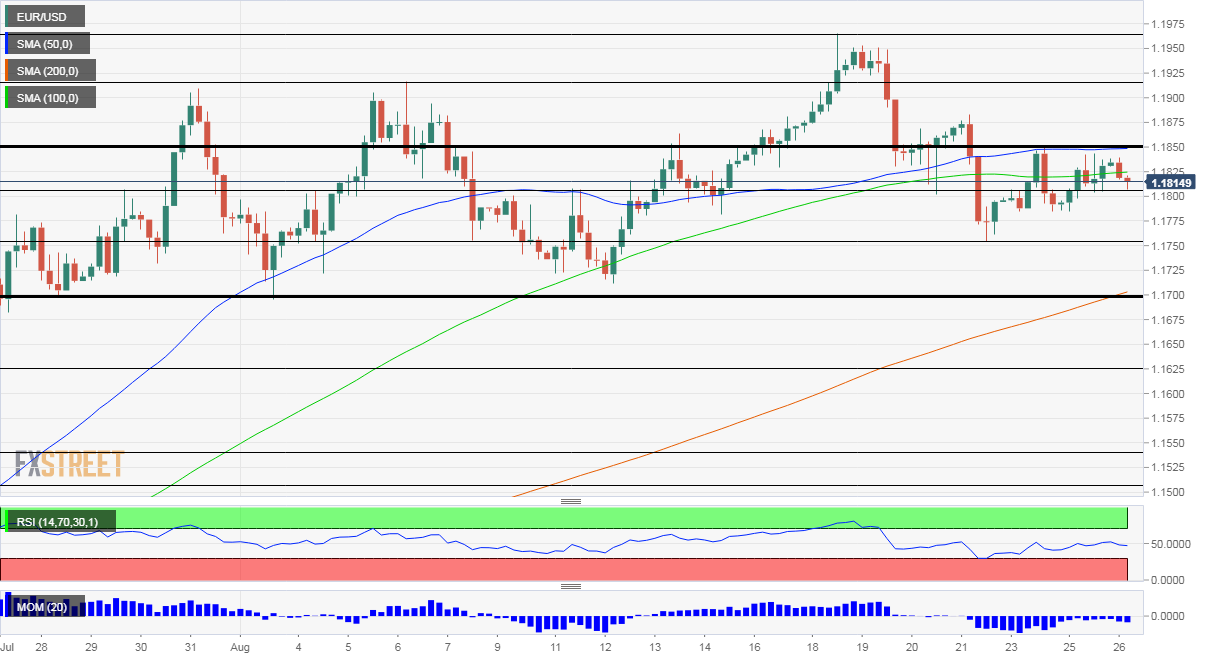 Euro/dollar is capped under 1.1850, which held the currency pair down in recent days – and is also where the 50 Simple Moving Average on the four-hour chart hits the price. EUR/USD is also struggling to hold onto the 100 SMA and momentum remains to the downside.
