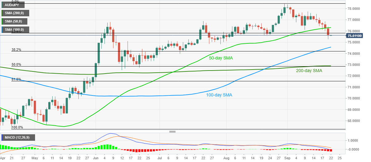 AUD/JPY consolidates the losses nears the six-week lows while taking rounds to 75.60 amid the early Tuesday morning in Asia. The pair’s break of the 50-day SMA dragged to the lowest since August 03 while bearish MACD signals indicate further downside.