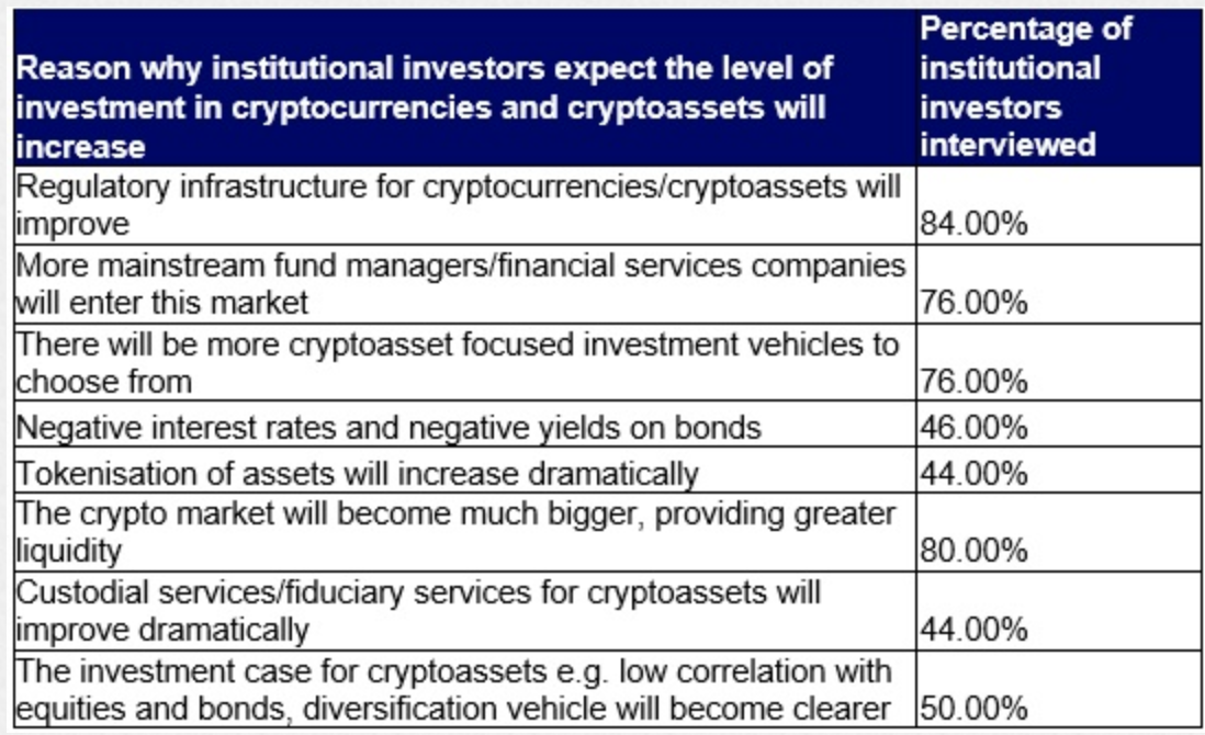 The team surveyed pension funds and insurance companies in the US and UK. The overwhelming majority confirmed that they considered increasing their allocation of digital currencies if the regulatory and liquidity conditions improve.